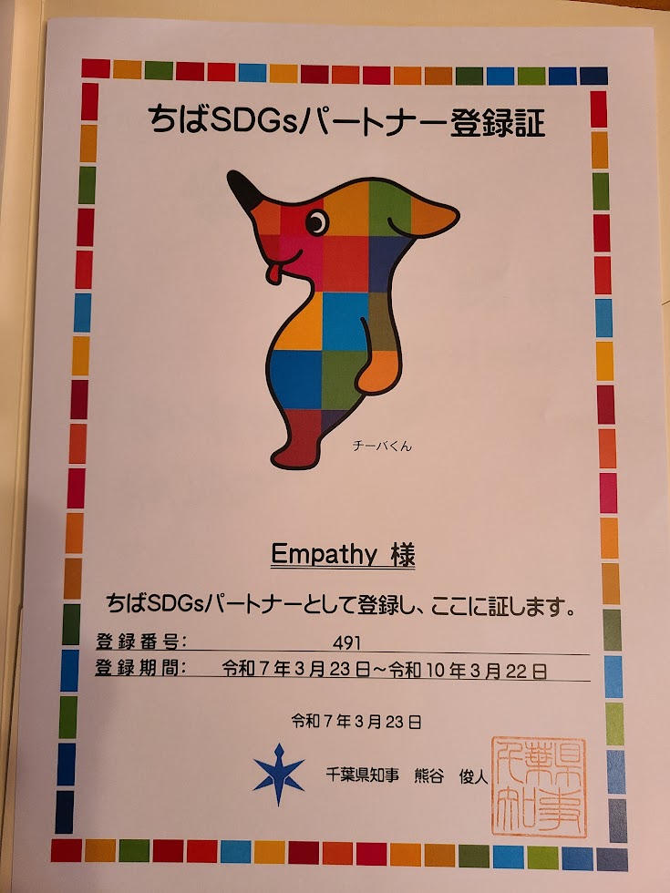 〖Empathy 〗が、ちばSDGsパートナーに登録していただきました。 (令和4年/3/23~令和7年/3/22まで)(第2期 令和7年/3/23~令和10年/3/22まで)